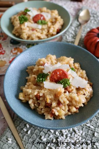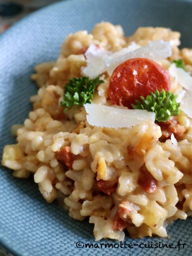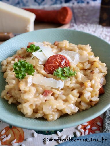 5/ En fin de cuisson, ajouter le potiron et le chorizo. Mélanger puis ajouter le beurre coupé en morceaux et le parmesan. Mélanger pour obtenir un risotto bien onctueux.