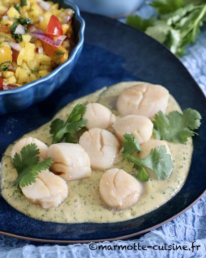 Saint-Jacques poêlées, sauce mangue, coco et coriandre et salsa de mangue