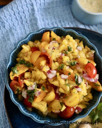1/ On commence par la salsa de mangue. Couper les tomates cerise en quatre et couper la chair de mangue en petits cubes. Peler et émincer l’oignon. Mettre dans un saladier, ajouter la coriandre, la sauce soja, la sauce sriracha. Saler et poivrer légèrement. Mélanger et réserver au frais.