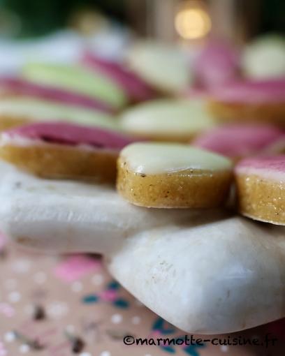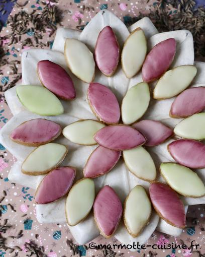 8/ Laisser sécher de nouveau à l’air libre une nuit ou faire sécher au four à 120 °C pendant 5 minutes. Ne manipuler qu’une fois totalement refroidi. Je préfère faire sécher mes calissons au four. On peut ainsi les garder quelques jours de plus sans risque.