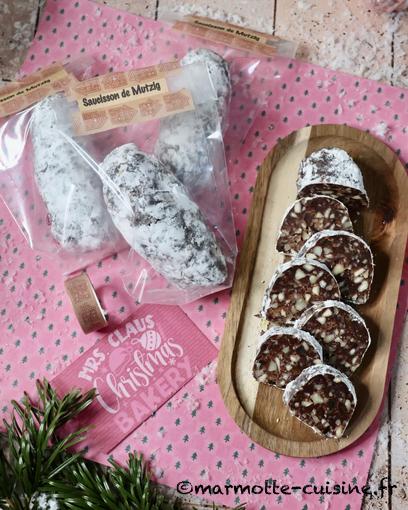 Pour en revenir à nos saucissons, j’ai trouvé le visuel bluffant et ils étaient vraiment délicieux. Mais peut-on se tromper en associant chocolat, amandes et agrumes confits, je ne pense pas !