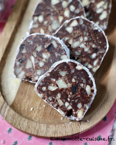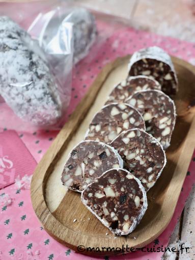 On retrouve des saucissons au chocolat dans différentes cuisines, et dans leur composition de beaucoup, on retrouve des morceaux de biscuits ou même des mini chamallows. Ce que j’ai aimé dans cette version de Christophe Felder et de Camille Lesecq, c’est qu’elle ne contient que des ingrédients bruts ou peu transformés comme les fruits confits. Je trouve cela plus satisfaisant et meilleur de n’utiliser que ce genre d’ingrédients plutôt que de faire du fait maison avec des produits industriels, même si je suis capable de faire quelques entorses au besoin.