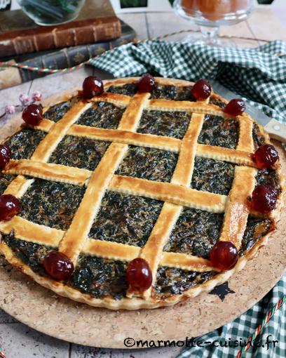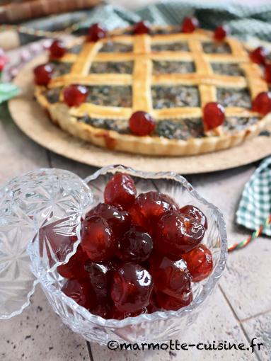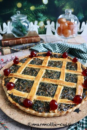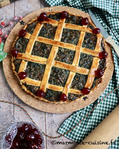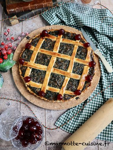 Au cœur de l’été, Jackie du blog La Cuisine de Jackie a posté cette recette de tarte sucrée aux épinards. Cela m’a tout de suite interpellée et m’a rappelé la célèbre tourte aux blettes sucrées de Nice. Avec sa parure en cerises confites, cette tarte m’a semblé très rétro et festive. Vert et rouge, dans ma tête, c’est Noël, logique, non ?
