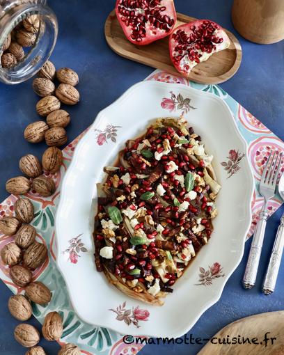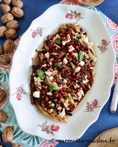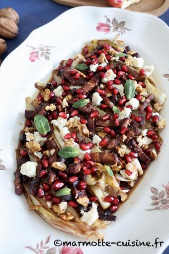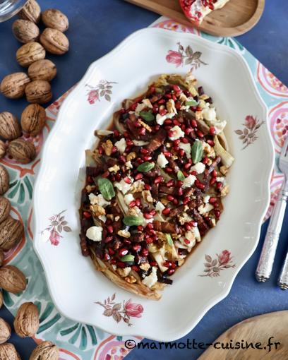 La deuxième recette joue davantage la carte de la gourmandise et de la douceur grâce au fromage, aux lardons et aux endives cuites dans un mélange de jus d’orange et de mélasse de grenade. Vous pouvez remplacer cette dernière par du sirop d’érable ou du miel pour un résultat plus doux et sucré.