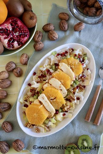 2/ Éplucher les kiwis et les couper en dés. Les parsemer sur les endives. Ajouter les cerneaux de noix et les arilles de grenade.