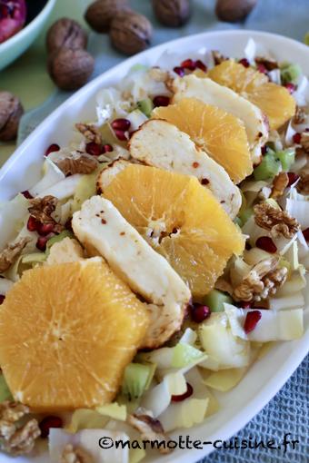 5/ Disposer les tranches de halloumi et d’orange en les alternant sur la salade.