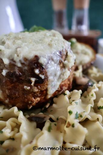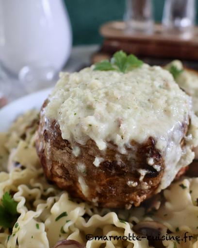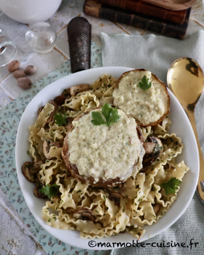 Servi avec des pâtes et une poêlée de champignons, c’est un repas bien hivernal et fromager qui permet de sortir des classiques tartiflettes et raclettes.