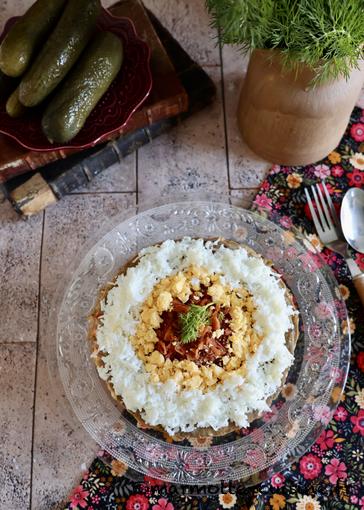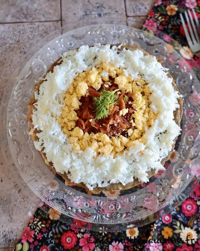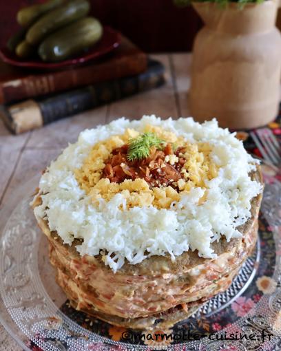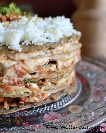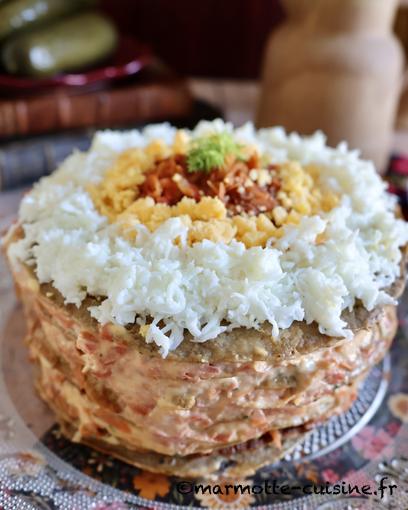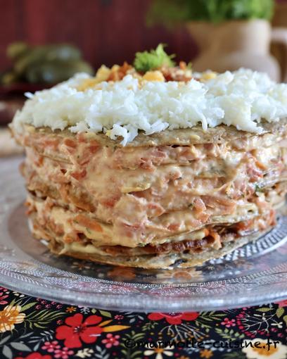 4/ Procéder au montage du gâteau. Déposer une crêpe sur un plat de service et déposer une grosse cuillère à soupe de légumes sautés. Les étaler en une couche uniforme. Recouvrir de mayonnaise et parsemer d’aneth. Recommencer jusqu’à épuisement des ingrédients et en finissant par une crêpe.