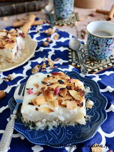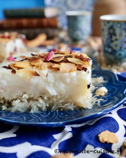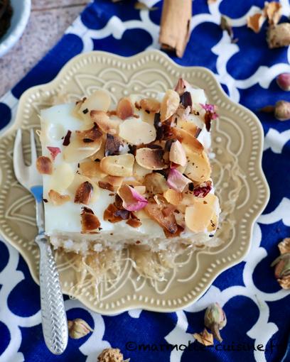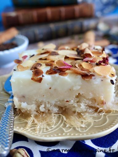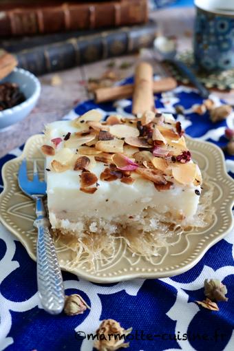 Il se compose d’une base en kadaïf au sirop épicé et d’une crème à base de fécule de maïs parfumée à la fleur d’oranger. Cette crème n’est pas sans rappeler la (ou le ?) mouhalabieh, cette spécialité libanaise à la texture un peu particulière et délicatement parfumée à la fleur d’oranger.