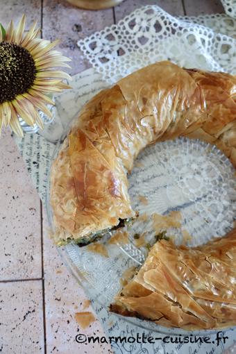 2/ Graisser un moule à savarin, disposer les feuilles de pâte filo dans le moule en les faisant chevaucher légèrement et en laissant les extrémités largement débordées sur les côtés. Badigeonner légèrement les feuilles de pâte filo d’huile d’olive. Verser la garniture dans le moule en la tassant un peu. Rabattre les bords des feuilles filo sur la garniture. Badigeonner les feuilles rabattues d’huile d’olive.