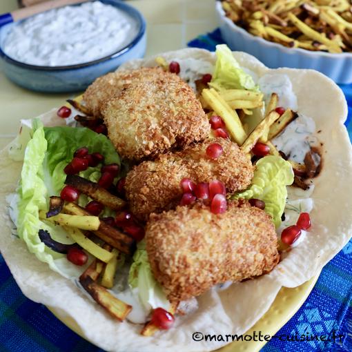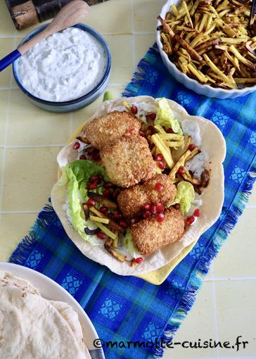 5/ Monter les tacos. Faire tiédir les tortillas si nécessaire. Tartiner la sauce sur une tortilla, déposer une ou deux feuilles de salade, ajouter une portion d’allumettes de panais et quelques morceaux de poisson pané. Décorer d’arilles de grenade si vous le souhaitez.