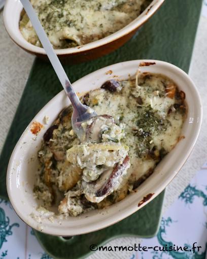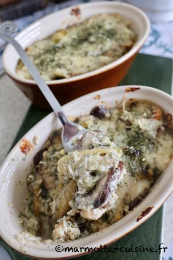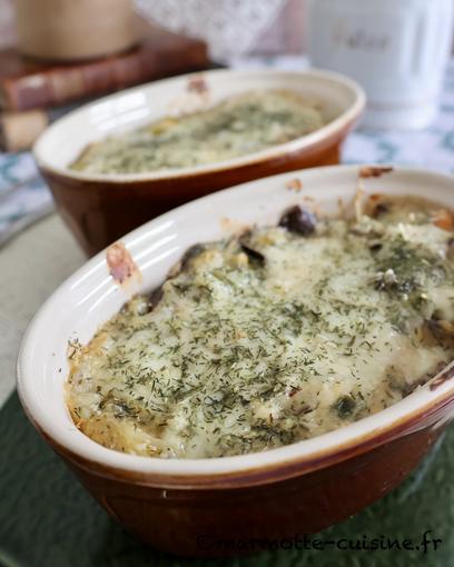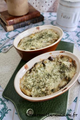 Je me suis inspirée d’une recette de Christine du blog Pause-Nature pour réaliser ce gratin végétarien qui associe champignons, œufs durs et béchamel. On est loin des œufs à la florentine mais j’ai trouvé cette recette délicieusement régressive et bien savoureuse.