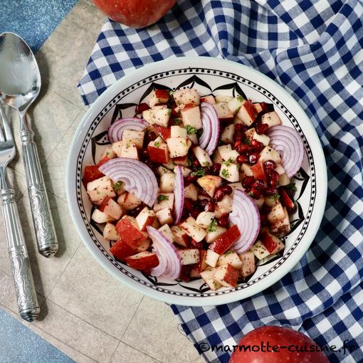 Salade de pommes au sumac, oignon rouge et grenade et œufs mimosa au foie de morue