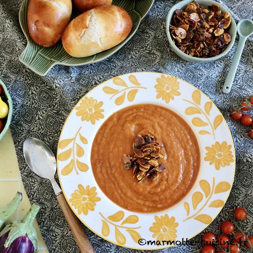 Soupe d’aubergines, tomates et poivrons rôtis